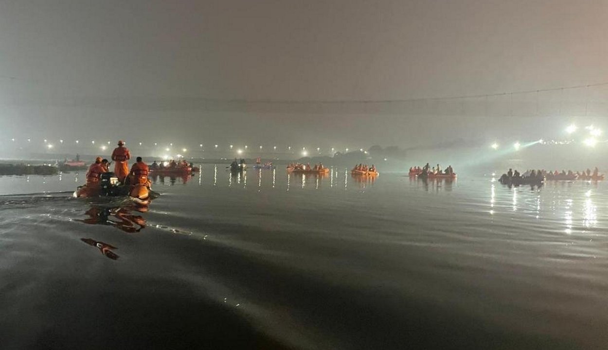 Az NDTV jelentése szerint 141 ember meghalt, 177 embert pedig kimentettek, amikor a gyaloghíd, amelyet nemrég nyitottak meg újra a felújítást követően, összerogyott.