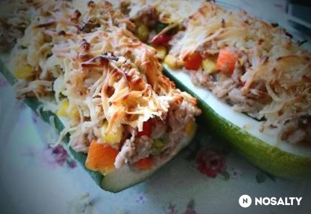 A cukkinit megpucoljuk, félbevágjuk, kimagozzuk, egy tepsibe vagy hőálló tálba tesszük, kevés olajat csurgatunk rá, hogy könnyebben megpuhuljon a sütés során. A tonhalat az olajjal és az apróra vágott lilahagymával megdinszteljük. Éppen csak annyira, hogy a hagyma megpuhuljon. Ezután a zöldségkeveréket hozzáadjuk. (Ha mirelitből csináljuk, előtte kevés vajon pároljuk meg.) Keverés után mehet bele a só, bors, tejföl, végül a fokhagymanyomón átpasszírozott fokhagyma. (Ha a végén tesszük bele, nem fő ki annyira az íze.) 1–2 rottyanás után kész is, kanalazzuk a cukkinikbe. A tetejét megszórjuk füstölt sajttal. Előmelegített sütőbe tesszük, 180 fokon kb. 30 percet sütjük, amíg a cukkini megpuhul, és a sajt megpirul a tetején. (www.nosalty.hu)