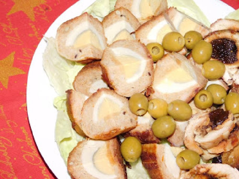Megfőzzük a tojásokat. Mikor kihűlnek, megpucoljuk, félbevágjuk mindegyiket. A darált húst, fűszereket, zúzott fokhagymát, beáztatott is kicsavart kenyeret, tojásokat összegyúrjuk. Ha lágy a massza, zsemlemorzsát teszünk még hozzá. Nagyobb gombócokat veszünk a tenyerünkbe, ellapítjuk, fél tojást és darab sajtot teszünk bele, összecsomagoljuk. Baconszeletbe csavarjuk, sütőpapírral bélelt tepsibe pakoljuk. 180 fokon addig sülnek, míg szépen megpirulnak. Negyedelve tálaljuk. Aszalt szilvával töltött csirkemell van mellette, a másik nagy kedvenc az előételek között. Nincs különösebb receptje, a vékonyra szeletelt csirkemellet egymás mellé tesszük, sózzuk-borsozzuk, kirakjuk egy sor aszalt szilvával és vékonyra szeletelt Brie sajttal. Mindezt alufólián. Annak segítségével feltekerjük, s belecsomagolva sütőben sül. Kihűlés után szeleteljük. (http://gerdisuti.blogspot.com)