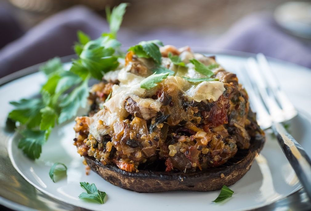Hozzávalók: 4 nagy csiperkegomba, 2 gerezd fokhagyma, 4 ek olívaolaj, 1 csokor petrezselyemzöld, 1 ek rozmaring, 1 ek oregánó, 4 dkg magozott olajbogyó, 4 dkg darált mogyoró, 1 ek csípős mustár, 4 dkg zsemlemorzsa, só, frissen őrölt bors, 5–10 dkg feta sajt, zöldfűszer (a díszítéshez).