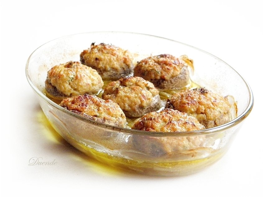 Hozzávalók: 10 nagy fej gomba. A töltelékbe: 10 szép fej gombának a szára, 10 dkg füstölt szalonna, 10-15 dkg trappista sajt, 1 picike fej hagyma (diónyi méret), 1 gerezd fokhagyma, só, frissen őrölt bors, kakukkfű. A mártásba: 1 nagy fej hagyma, 2 gerezd fokhagyma, 1/2 evőkanál olívaolaj, só, frissen őrölt bors, kakukkfű, kevés citromlé, 1 tk mustár, 1 ek szójaszósz, 1 dl tejszín.