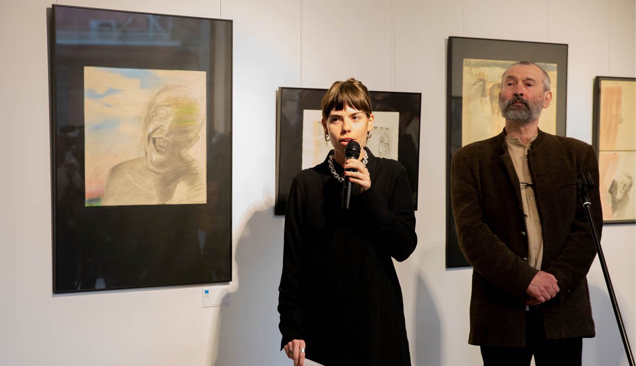 Beszédében a kurátor rámutatott, a szemlélőjének élményt nyújtó „képzőművészeti munka” mögött nemzedékekre visszamenő tapasztalat és fejlődés rejlik. Így jutottunk oda, hogy napjainkra a kép kommunikációvá váljék, „de ez talán régebben sem volt egészen másképp”. Hiszen az édesapja is rajzokban, animációkban fogalmazta meg a rendszerrel ellentétes véleményét, és így tudott „egyenes hátú férfiember maradni”.