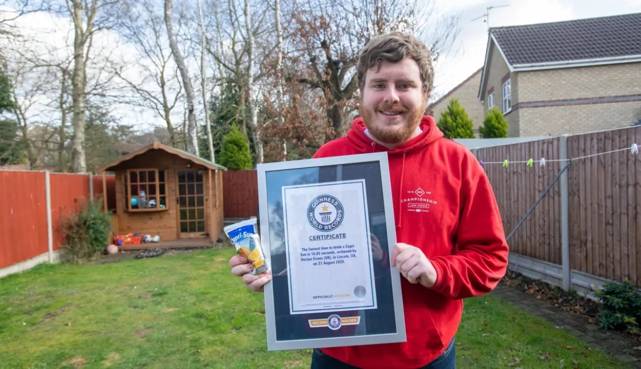 Declan Evans 16,65 másodperc alatt ivott meg egy Capri-Sun nevű szívószálas üdítőt. Ez több mint egy másodperccel több, mint a korábbi 18 másodperces csúcs. Bár a rekordról beszámoló hírben nem szerepel, milyen kiszerelésről van szó, ez az üdítő általában két decis.
