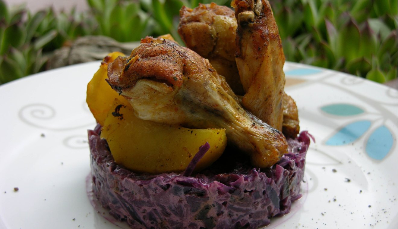 Ma például nagy kedvencem, a sült libacomb került a tányéromra. Ha drágul a disznó, együnk libát helyette alapon, pirosra pirulva, szájbaomlósan. Párolt piroskáposzta kísérte, melyet almával, őrölt köménnyel, ecettel, cukorral, tejföllel társítok. Igencsak passzoló társa lehet a libacombnak a krumplipürével töltött alma, melyet a sütői meleg olvaszt eggyé.
