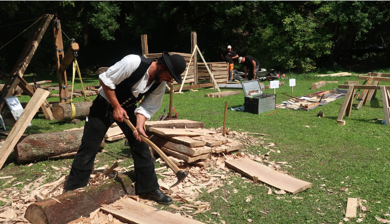 Egy szász férfi (fotónkon) éppen házpadlónak való deszkadarabokat faragott ki, azt mondta, Németországban is dolgozott, ám most nagyobb értelmét látja annak, hogy ősei tudását itthon kamatoztassa. Arrább gerendákból építettek házat, ki lehetett próbálni a hagyományos fafaragó szerszámokat, a kőfaragást, a kovácsszerszámokat, a bútorrestaurálást, a vályoggal való vakolást, és még sok mindent.