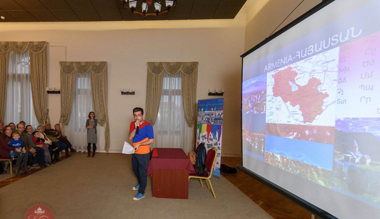Alen Margaryan EVS-önkéntes, A környezet barátai (Friends of the environment) projekt keretében idén április végéig tevékenykedik a Zöld Nap Egyesületnél. Bemutatóját Örményország történelmi és földrajzi jellegzetességeinek ismertetésével kezdte, majd annak látványosságait, népviseletét, híres személyiségeit ismertette. A legfontosabb ünnepek témaköre kapcsán kiderült, az örmények kifejezetten szeretik a különböző ételkülönlegességek köré épülő fesztiválokat. Különleges ünnepük a Vardavar, amely során az utcára vonuló emberek vízzel locsolják le egymást a lelki megtisztulás érdekében. A videóbejátszásokkal színesített előadás egyik meglepetéseként Alen örmény nyelven szavalt és énekelt a jelenlévőknek.