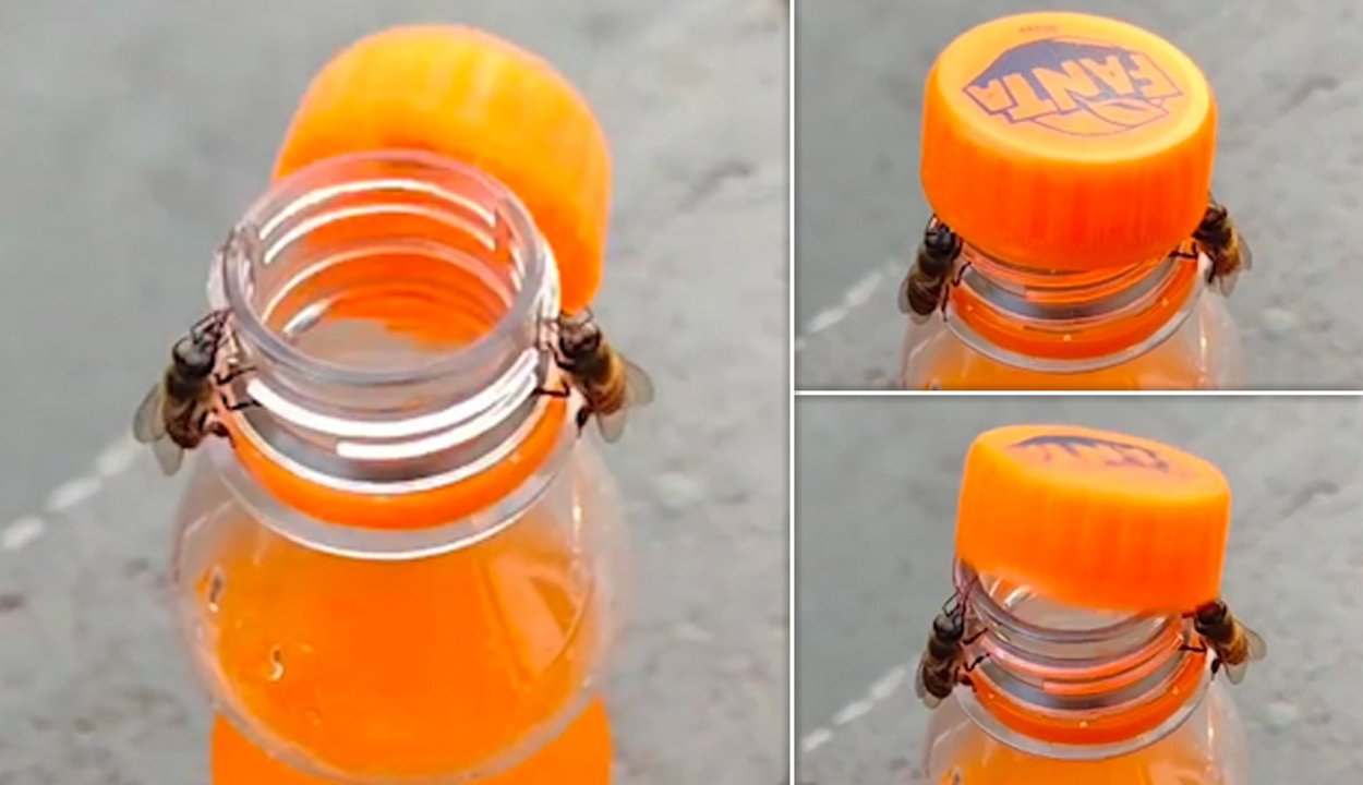 Videón, ahogy két méhecske profi csapatmunkával kinyit egy üdítős üveget