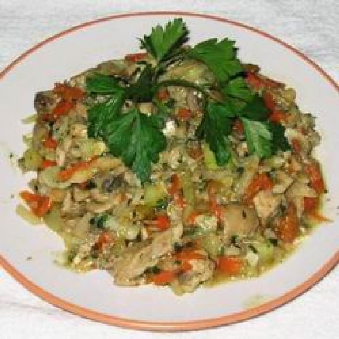 Hozzávalók: 40 dkg pulykamell, 3 evőkanál olívaolaj, 25 dkg gomba, 2 fej vöröshagyma, 2 sárgarépa, 2 fehérrépa, 1 kis fej zeller, 2 zöldpaprika, 2 gerezd fokhagyma, 25 dkg cukkini, zeller zöldje, petrezselyem, só, bors, őrölt tárkony, szerecsendió, őrölt gyömbér, cayenne bors, néhány szem olívabogyó, 1 teáskanál étkezési keményítő.