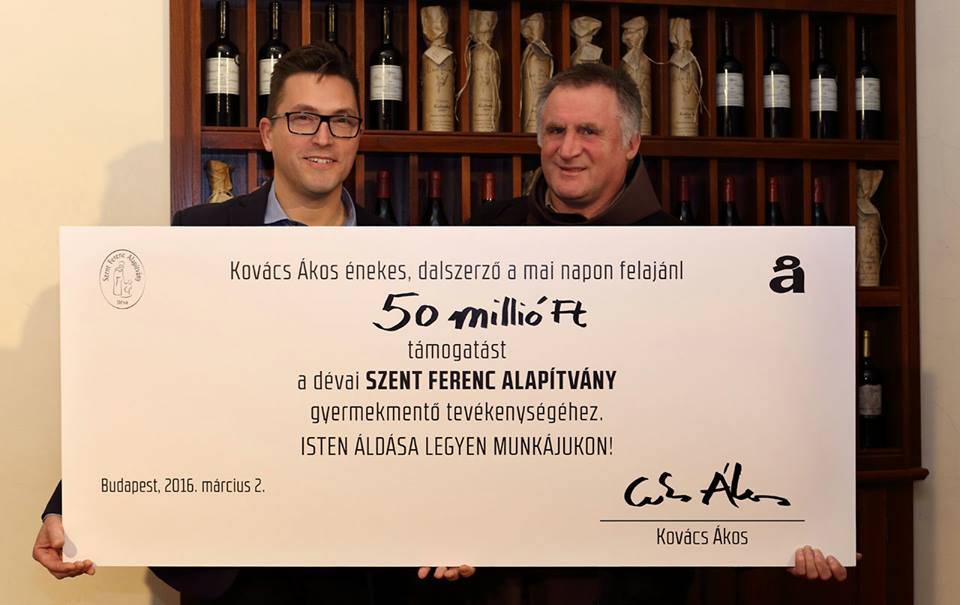 Jelentős összeggel támogatja a dévai Szent Ferenc Alapítvány gyermekmentő tevékenységét Ákos. Az adomány átadására az Andante Borpatikában került sor – adta hírül Facebook oldalán az énekes.