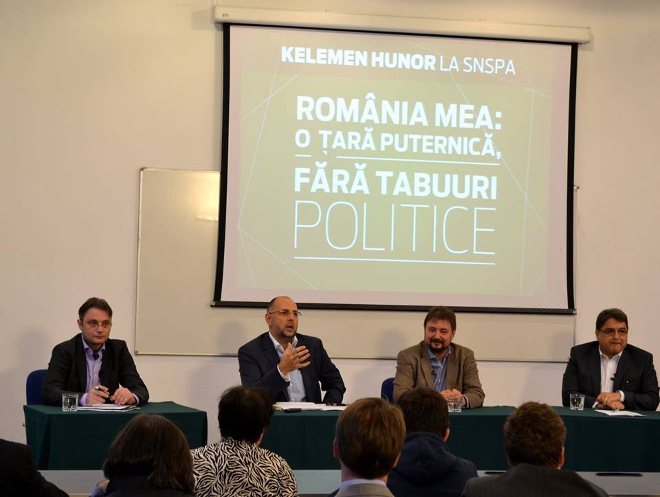 A bukaresti Közigazgatási és Politikatudományi Egyetemen rendezett, Az én Romániám politikai tabuktól mentes erős ország című fórumon Kelemen Hunor kettős minőségben, államfőjelöltként és a székelyföldi autonómiastatútum előterjesztőjeként válaszolt az érdeklődők kérdéseire. A csaknem háromórás fórumon a román médiában leggyakrabban szereplő politikai elemzők többsége jelen volt, többen kifejtették véleményüket, illetve tettek fel kérdéseket.