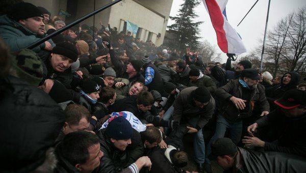 Csütörtök délben ugyanakkor oroszbarát tüntetők mintegy kétszáz fős csoportja áttörte a krími parlament környékét lezáró rendőrkordont Szimferopolban, és orosz zászlókkal az épület elé vonult. A többségében orosz ajkú Krími Autonóm Köztársaság parlamenti és kormányépülete előtt a tüntetők Oroszországot éltetik, és államfőjüknek nevezik a múlt szombaton elmenekült, azóta leváltott Viktor Janukovics ukrán elnököt.