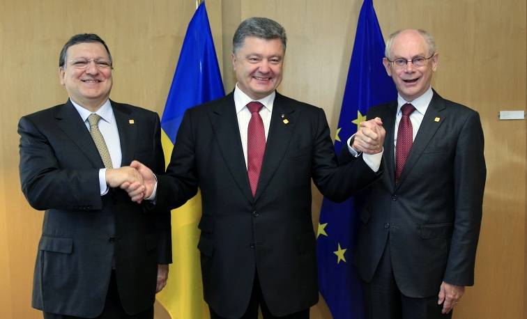 A május végén megválasztott ukrán elnök közölte: azzal a tollal írja alá az egyezményt, amellyel novemberben Vilniusban kellett volna, ami a történelmi események elkerülhetetlenségét jelképezi. Porosenko úgy vélekedett, hogy a három ország a megállapodás értelmében fájdalmas, de régóta időszerű reformokra szorul. Tudatta azt is, az ukrán parlament hamarosan ratifikálja az egyezményt, és bízik abban, hogy ezt az uniós tagállamok is mielőbb megteszik.