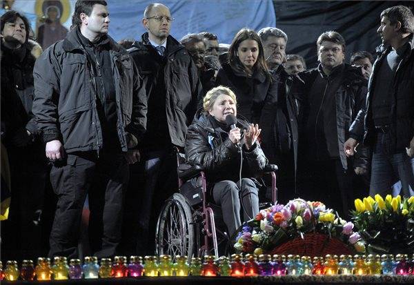 Az ukrán ellenzék aznap szabadon engedett vezéralakja kerekes székben ülve szólt a Janukovics hatalomból való távozását követelő több tízezres tömeghez.